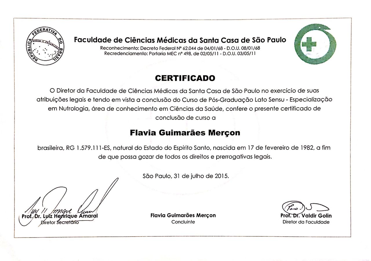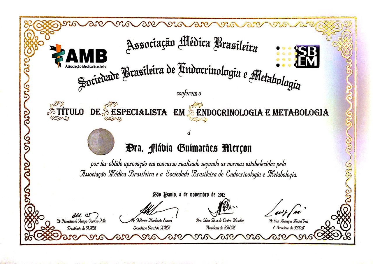 - Título de Especialista em Endocrinologia e Metabologia, Sociedade Brasileira de Endocrinologia e Metabologia, 2012